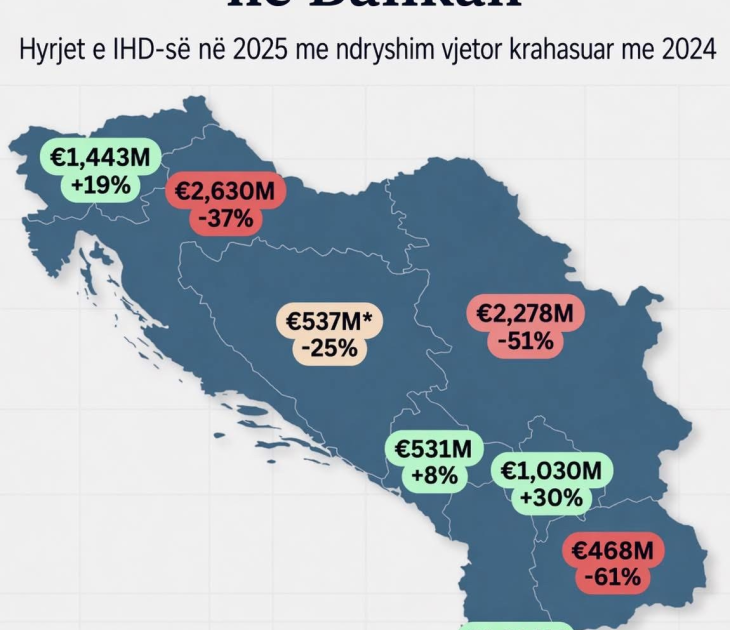 Të dhënat e publikuara në analizat rajonale për Investimet e Huaja Direkte në Ballkan tregojnë një alarm serioz për Republikën e Maqedonisë së Veriut: rënie prej 61% të investimeve të huaja direkte në vitin 2025 krahasuar me vitin 2024, me vlerë totale prej vetëm 468 milionë eur