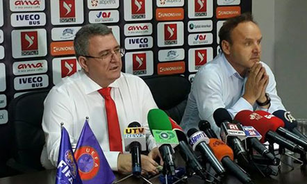 Presidenti i Federatës Shqiptare të Futbollit, Armando Duka, në një konferencë për shtyp pas vendimit të Gjykatës së Arbitrazhit Sportiv…