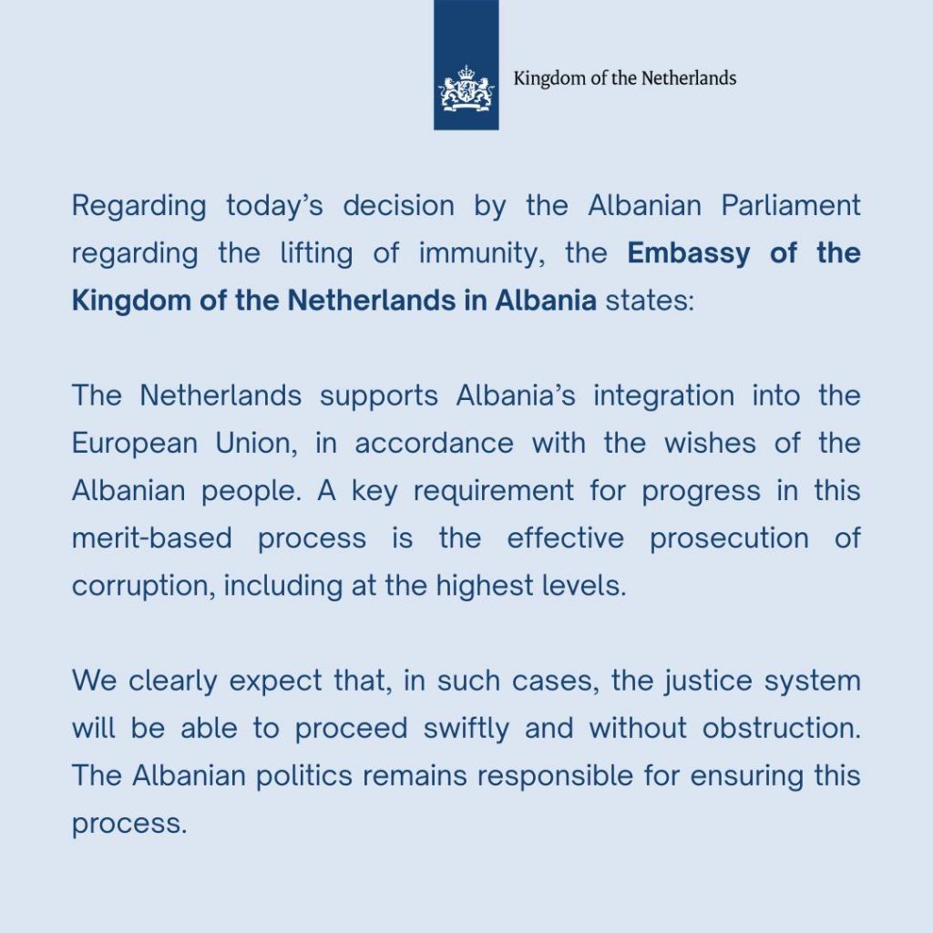 Pas vendimit të sotëm të Parlamentit lidhur me imunitetin e deputetes Belinda Balluku, Ambasada e Mbretërisë së Holandës në Shqipëri deklaroi se “Holanda mbështet integrimin e Shqipërisë në Bashkimin Evropian, në përputhje me dëshirën e popullit shqiptar”.