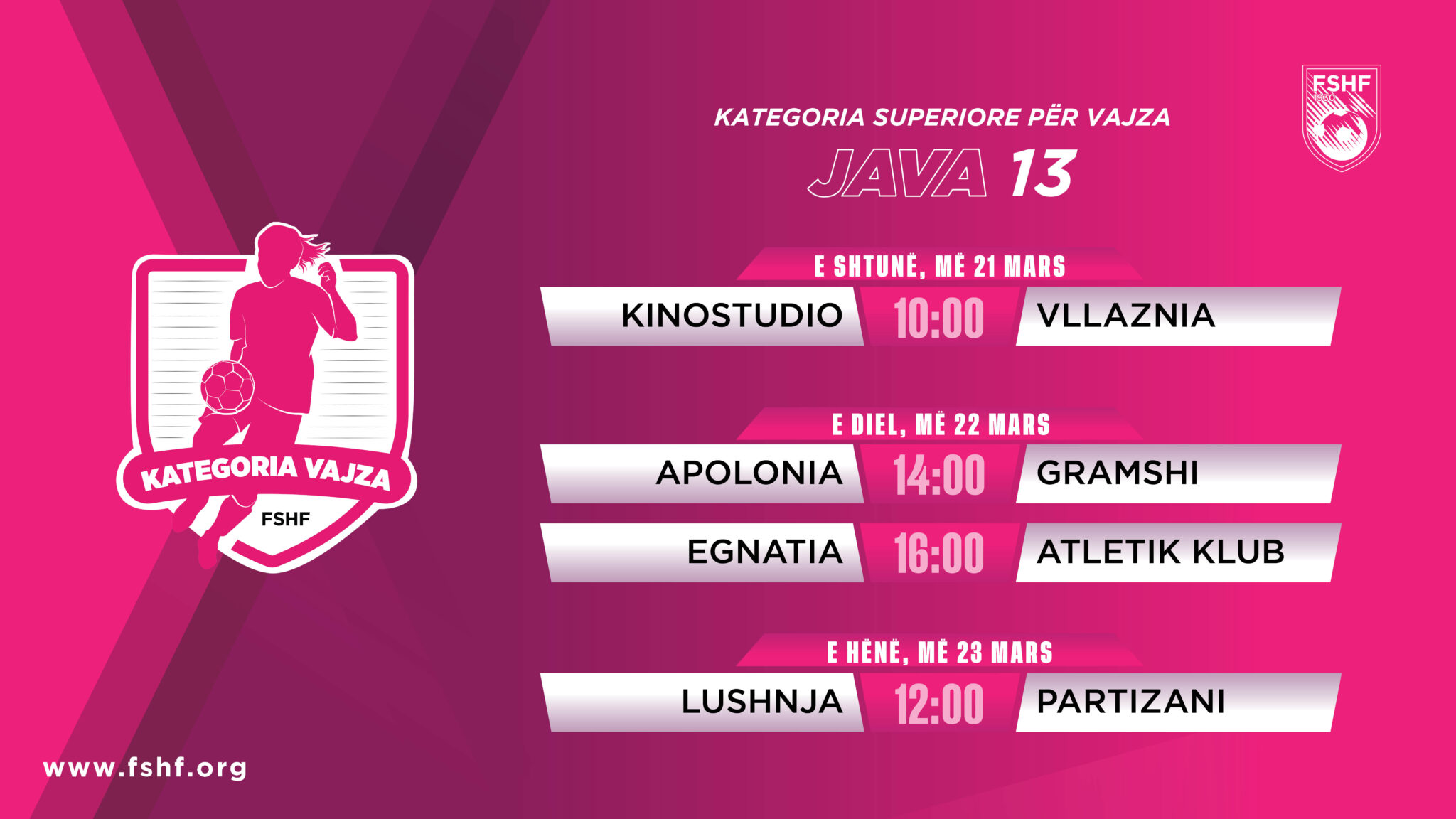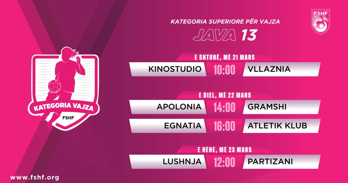 Java e 13-të e kampionatit të vajzave do të zhvillohet në tre ditë, më 21, 22 dhe 23 mars, duke premtuar sfida tërheqëse dhe me ndikim në renditjen e përgjithshme.