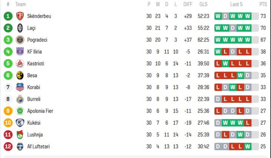 Në pjesën tjetër të tabelës janë Korabi dhe Burreli me nga 33 pikë, Kukësi dhe Apolonia me nga 27 pikë, ndërsa Lushnja ka 26 pikë dhe AF Luftëtari 25 pikë.