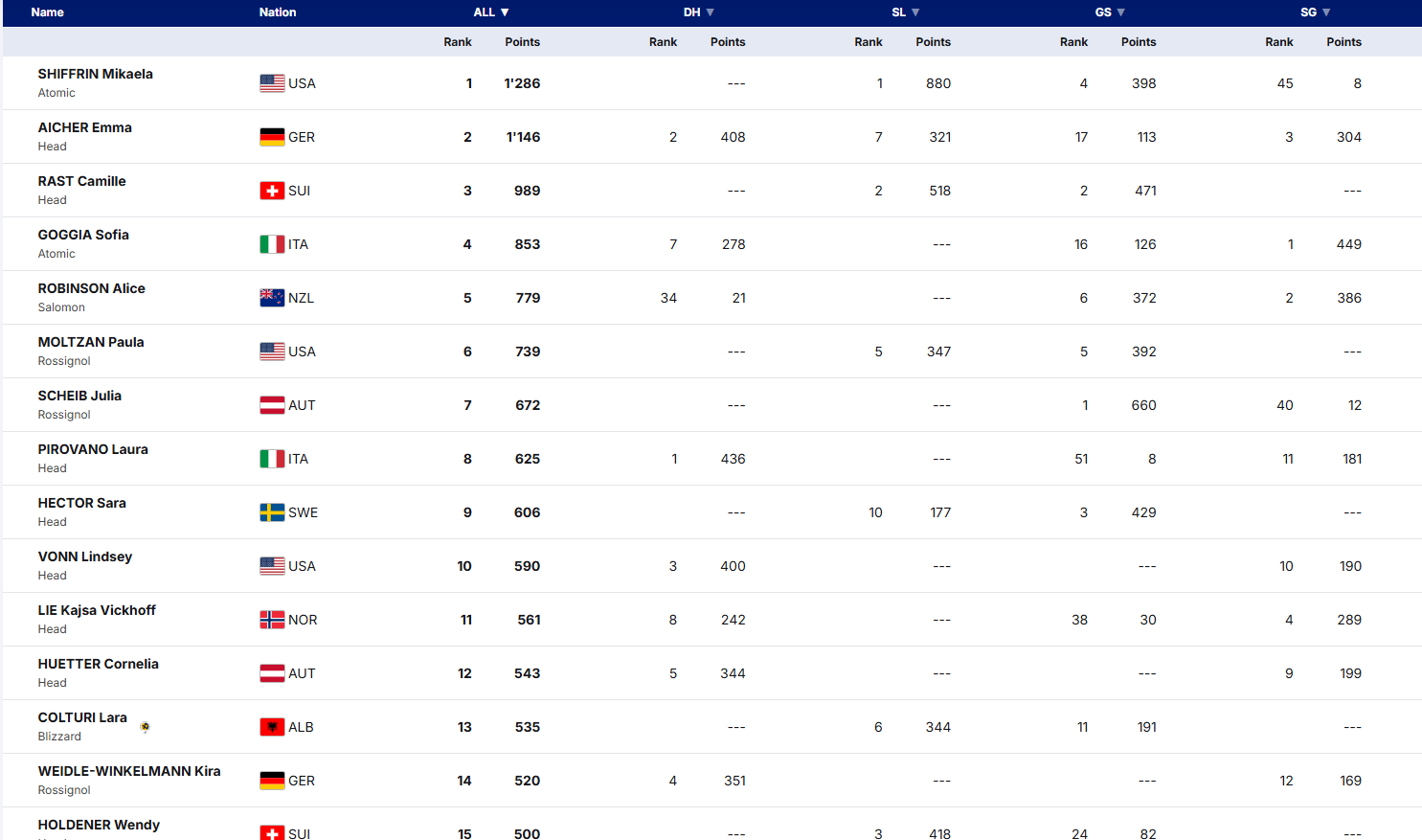 Renditjen e përgjithshme e kryeson Mikaela Shiffrin me 1286 pikë, e ndjekur nga Emma Aicher me 1146 pikë dhe Camile Rast me 989 pikë.
