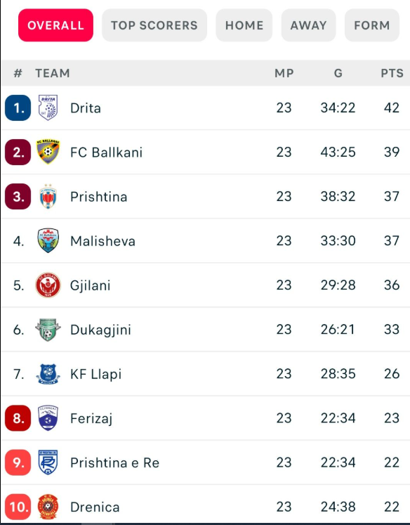 Ndërkohë, Gjilani vazhdon formën e mirë dhe me fitoren ndaj Ferizaj është ngjitur në vendin e pestë me 36 pikë, shumë pranë katërshes së parë. Dukagjini mban pozitën e gjashtë me 33 pikë.