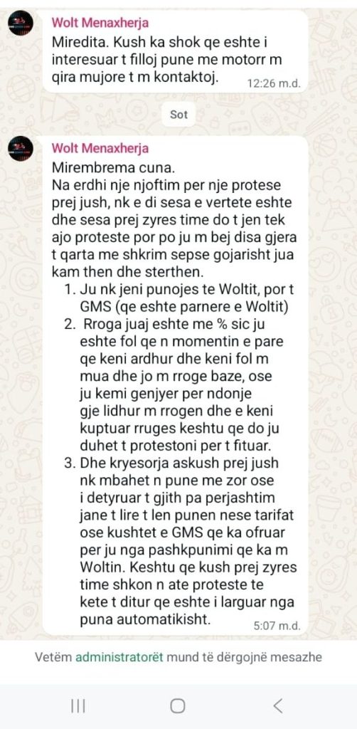 Një mesazh i shpërndarë në një grup komunikimi mes shpërndarësve të ushqimit ka nxitur debat mes punonjësve të platformës së dërgesave Wolt dhe bashkëpunëtorëve të saj në Shqipëri.