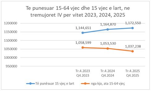 Ndërkohë sipas Anketës Tremujore të Forcave të Punës , nuk paraqitet e njëjta prirje, përsa i përket Të punësuarit e moshës së punës 15-64 vjeç. Nëse numuri i tyre në tremujorin e katërt të vitit 2023 ishte 1 milion e 58 mijë e 599 vetë ose 86 mijë e 53 vetë më pak se numuri i të punësuarve 15 vjeç e lart në atë periudhë. Në tremujorin e katërt të vitit 2024, numuri i të punësuarve të moshës 15-64 vjeç rezultoi me rënie ose 1 milion e 53 mijë e 530 vetë. Kjo rënie vazhdoi edhe në vitin 2025 ku në tremujorin e katër të tij, numuri i të punësuarve të këtij grupimi rezultoi 1 milion e 37 mijë e 238 vetë, duke u pakësuar me 21 mijë e 361 vetë, krahasuar me të njëjtën periudhë të vitit 2023, por ndërkohë duke qenë 135 mijë e 313 vetë më pak se të punësuarit 15 vjeç e lart.