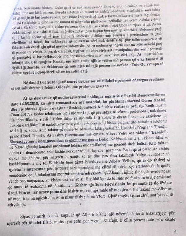 “Sipas materialit të administruar: Kjo agjenci nuk dispononte përgjim të bisedës së zhvilluar midis shtetasit Albert Veliu dhe personit të pretenduar prej tij, si Geron (Agron) Xhafaj, por dispononte një regjistrim bisede mes shtetasit Albert Veliu dhe shtetasit Agron Laver Hyseni. Gjithashtu kjo agjenci na ka njoftuar që shtetasi Albert Veliu nuk kishte bashkëpunuar me të” – thuhet në një nga shkresat e Prokurorisë.