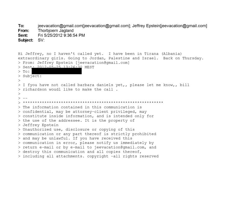 Një email i datës 25 maj 2012 tregon se Thorbjørn Jagland, Sekretar i Përgjithshëm i Këshillit të Europës në atë periudhë, i ka dërguar një mesazh Jeffrey Epstein, një ditë pas një vizite zyrtare në Shqipëri. Në komunikimin elektronik, Jagland shkruan shkurt: “Kam qenë në Tiranë, vajza të jashtëzakonshme”