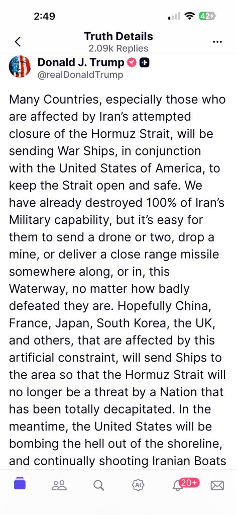 Presidenti amerikan Donald J. Trump ka deklaruar se shumë vende të botës duhet të dërgojnë anije luftarake për të ndihmuar në mbajtjen e hapur të Strait of Hormuz, pas tensioneve të rritura me Iran.
